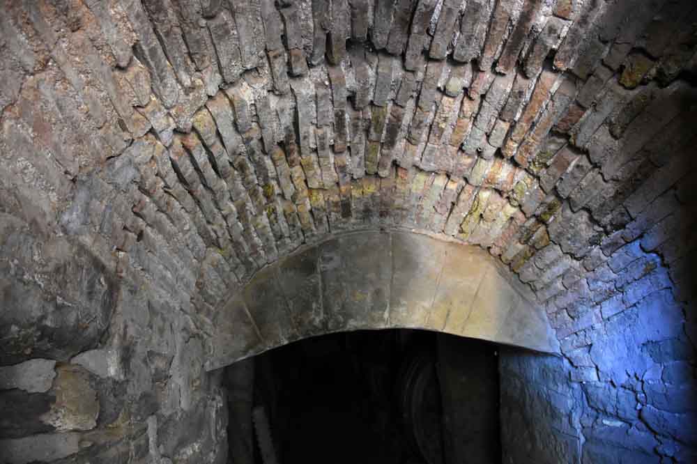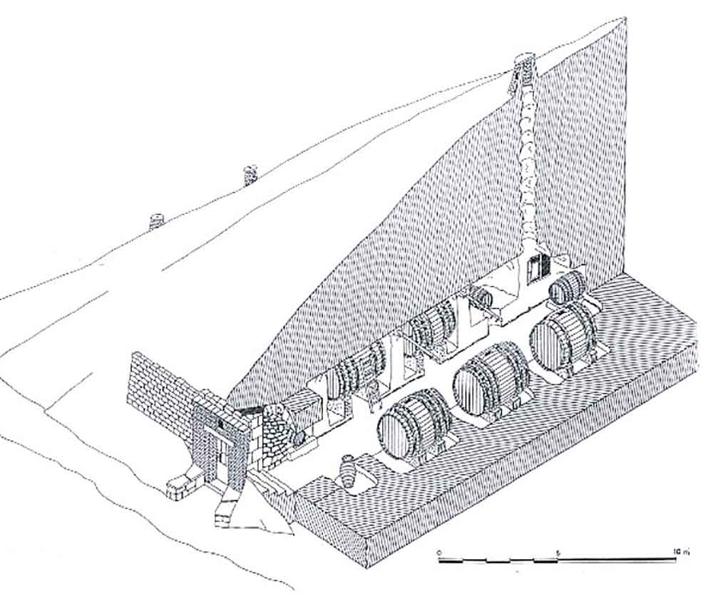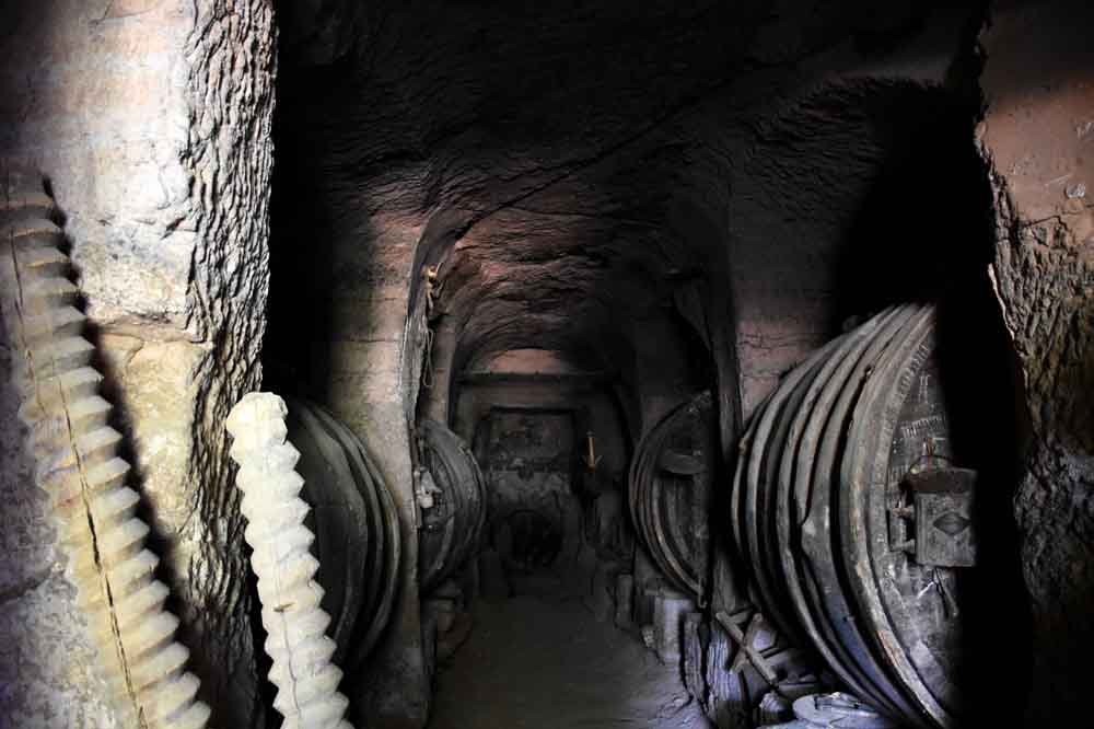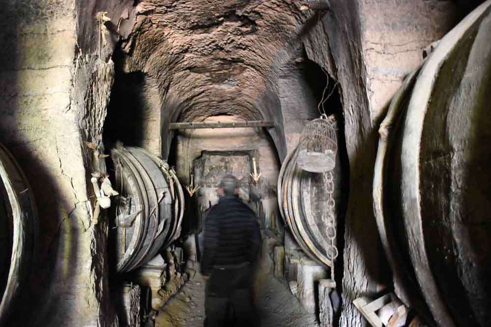 Su interior presenta un gran interés, a pesar de que su tramo final ha sido clausurado debido a su mal estado. Es una galería picada en la roca del terreno, cuya parte superior fue tallada en forma de bóveda de cañón irregular. A ambos lados de la galería se abren los espacios transversales para las cubas, tres en cada lado, cuyas embocaduras han sido también talladas en la piedra con el fin de convertirlas en arcos de medio punto más o menos regulares.